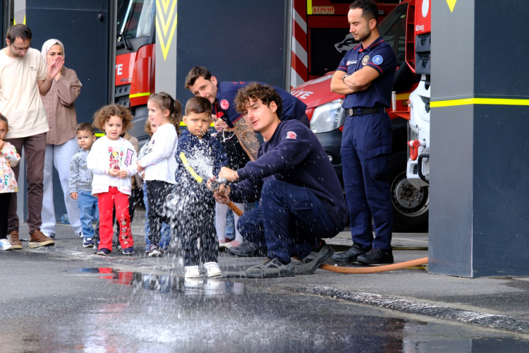 Ziyaret boyunca itfaiye araçlarına binen öğrencilerin mutlulukları gözlerinden okundu. Çocuklar ayrıca itfaiyeci abileriyle birlikte suyla müdahale fırsatı buldu.