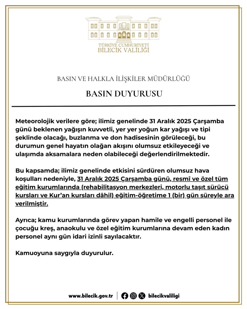 Bilecik‘te etkisini sürdüren olumsuz hava koşulları nedeniyle öğrencileri ve velileri sevindiren haber Vali Faik Oktay Sözer’den geldi. Vali Sözer, 31 Aralık 2025 Çarşamba günü il genelinde eğitim-öğretime 1 gün süreyle ara verildiğini açıkladı.